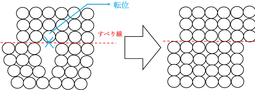 転位とは、結晶材料の中に存在する線状の欠陥のことです。 金属などがどのように変形するかを決める、とても重要な性質です。 結晶の中で、本来まっすぐ並ぶはずの原子の並びが 一部だけずれて“段差”のようになっている状態、この「ずれの線」が転位です。 外力等によって転位近辺の原子が再配置されることによって転位の位置が移動し材料が変形していきます。 原子面全体を一斉にずらすには大きな応力が必要となりますが、 この転位の移動により少しずつ原子配置をずらすことで、 理論値よりも小さい力で変形することを可能としています。 転位が動きやすいと柔らかくなり延性が高まり、動きにくいと硬くなります。